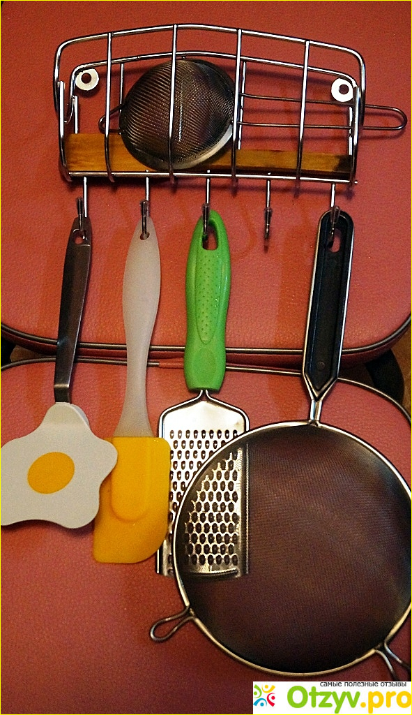 Эта полочка нам очень нравится. Несмотря на свой небольшой размер, она довольна вместительная, а на пяти крючках можно разместить довольно большое количество кухонной утвари и других небольших предметов. Полочка внешне аккуратная и симпатичная (качество изготовления хорошее), что облагораживает помещение кухни и делает её уютной. Эта полка не требует особого ухода. Для того, чтобы она выглядела, как новенькая, её достаточно периодически протирать влажной тряпкой с нейтральными чистящимися средствами. Стоит такая полка недорого, всего 170 рублей.