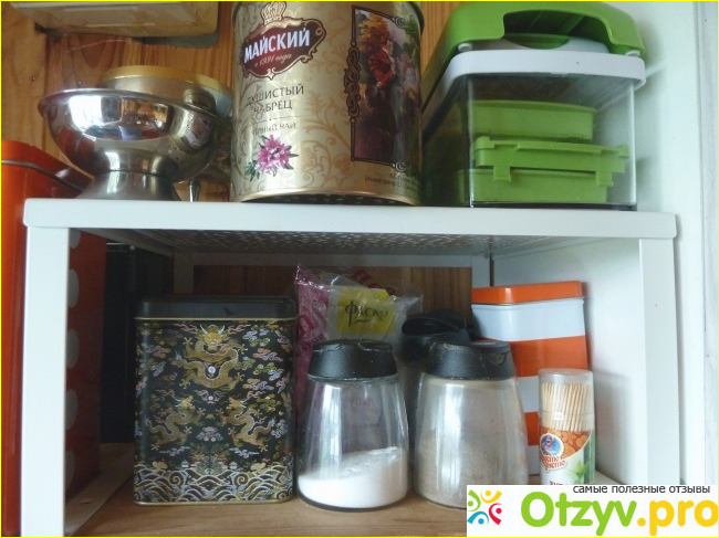 Очень довольна. Такая полочка собирается самостоятельно (закручиваются 4 винтика) и ставится в любой шкафчик на кухне. Она П-образная, т. е. получается что-то низкое можно ставить под нее (всяких баночек и пакетиков мелких на каждой кухне хватает), а что-то на нее. Сверлить ничего дополнительно не придется, а если будет какое-то перемещение по шкафам, то ее можно просто вытащить и поставить в другое место. Она, конечно именно под некрупные предметы. У меня на ней стоят приправы, баночки с чаями и пр. Такие полочки есть и побольше, другая модель. Металл белого цвета, выглядит нарядно и придает особый уют на кухне. Она почти не заметна, места не занимает, создает просто основу для того, чтобы поставить что-то еще в один уровень.