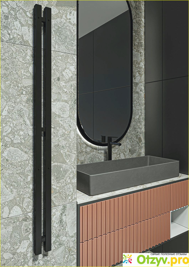 Ванная и так вся из прямых линий по сути, а здесь выбивается немного из общей картины, за счёт цвета ещё, у нас светлая ванная комната, но именно вот матовый цвет и эти косые перекладины эффект современного стиля и придают!