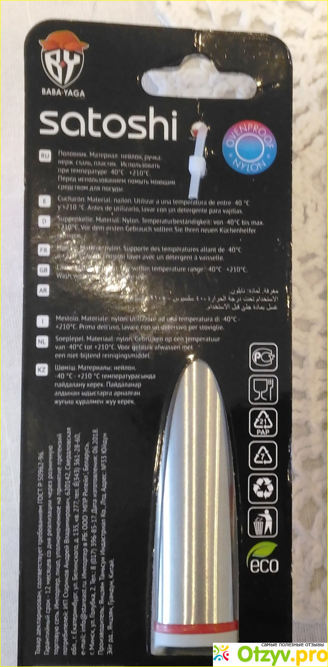 Информации о производителе и использованных материалах также размещена на упакове, а точнее на оборотной её стороне, в надлежащем виде и полном объёме. Это хорошо уже потому, что указывает на добросовестность производителя, что важно для абсолютно любого изделия, и половник не является в данном случае исключением из правил.