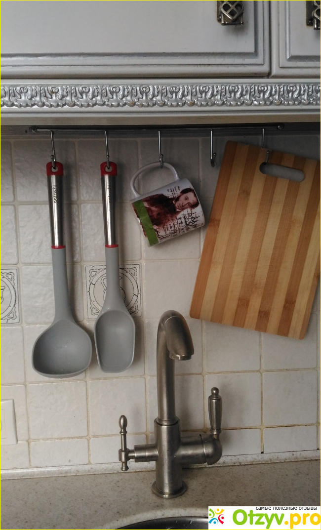 Помимо своего практического значения любая кухонная посуда или кухонная принадлежность должны, на мой взгляд, привлекать внимание своим интересным внешним видом и хорошим дизайном. Здесь всё это сочетается просто на отлично. Это относится и к удачно подобранной цветовой гамме и к использованным в производстве материалов. Ручка из нержавеющей стали, окантованная яркими, но не вычурными, полосками красного цвета, выглядит эффектно, да и в руке располагается весьма удобно. Кроме всего прочего, металл легче отмывается от жира, с которым половник безусловно "сталкивается" на кухне в процессе использования, а это опять таки плюс. А также такая удобная ручка с петлей позволяет подвесить половник в любом месте. Единственное, что следует учесть, так это небольшой диаметр отверстий на ручке, что означает необходимость подбора крючков необходимого размера, на слишком большие и "толстые" такой кухонный аксессуар подвесить не получится.
