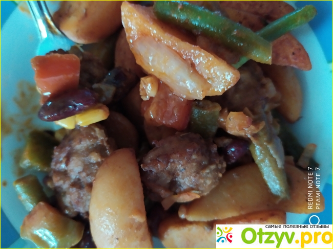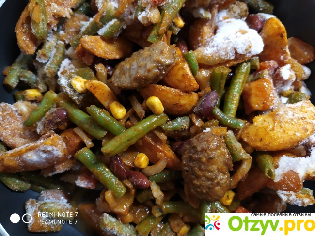 Смесь я потушила под крышкой минут 10 на сильном огне. И вот, что в итоге у меня получилось, картофель очень сочный и не сухой, фасоль и стейки тоже. Блюдо получилось очень сочное и разошлось на УРА! Гарнир делать вообще никакой не нужно, поскольку это самостоятельное блюдо и в составе есть мясо.