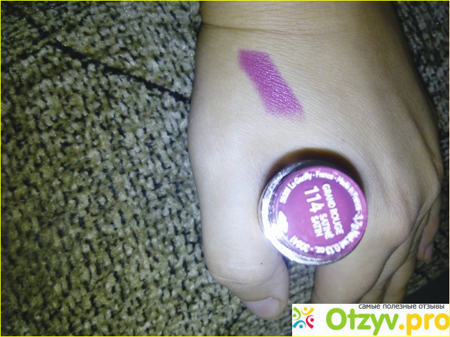 Помада класса Люкс, дорогогой красивый футляр золотого цвета, так и просится чтоб взяли его в ручки. На кришечке вверху фирменный логотип Ив Роше. Внизу номер помады, у меня цвет 114, Satine ранее был он Елегантно Розовый.