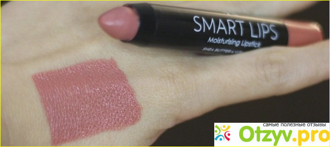 Помада представляет собой большой карандаш с выкручивающимся механизмом, следовательно вопрос о заточке отпал. Текстура помады кремовая и она равномерно наноситься и отлично распределяется по губам. Не оставляя проплешин, не выходит за рамки контура губ, не растекается со временем, но конечно, не очень стойкая и отпечатывается при перекусах и чаепитиях. На губах помаду приятно ощущать, ее нежный аромат не раздражает и легкая текстура не утяжеляет губы и не приносит дискомфорта в носке. Мои губы не всегда в идеальной форме, они склонны к шелушению и мне нравится что помада SMART LIPS MOISTURISING LIPSTICK не подчеркивает недостатки, а полностью их перекрывает.