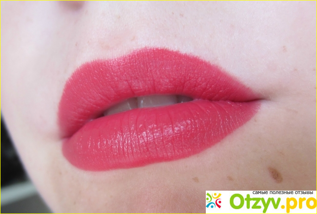 Очень порадовало, как помада ложится на губы — мягко и ровно. Мне даже карандаш для губ не понадобился. Помада действительно держится на губах около трех часов. По после ничего не мешает аккуратно подкрасить губы поверх первого слоя — получается очень даже ровно, повторно ложится без проблем.