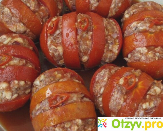 Блюдо получается очень вкусным. Фарш пропитается томатной кислинкой. Очень нежные и сочные помидоры понравятся всем.