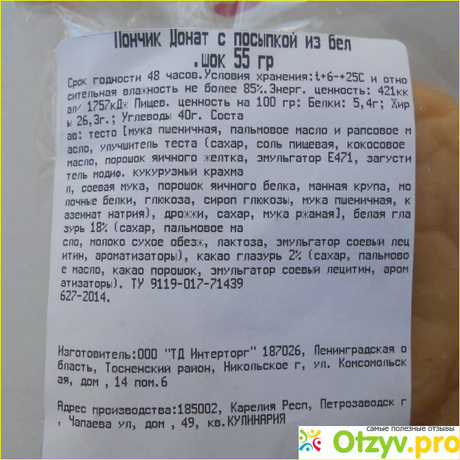 Но, здесь же был не тот случай... Сомнительный состав, дак ещё и отвратительный вкус! Это не пончик! Это, простите, булка! Причём невкусная булка! Бывает ешь свеженький и мягенький батончик и остановиться не можешь! А тут же пресное, не ароматное, безвкусое тесто, покрытое каплей шоколада... Знаете, я ни раз сама делала дома пончики, так они таяли во рту и тарелка с ними сметалась со стола в считанные минуты, не дождавшись закипания чайника... Причём, я делала обычные пончики, без, извините, белого шоколада или ещё какой-нибудь посыпки...