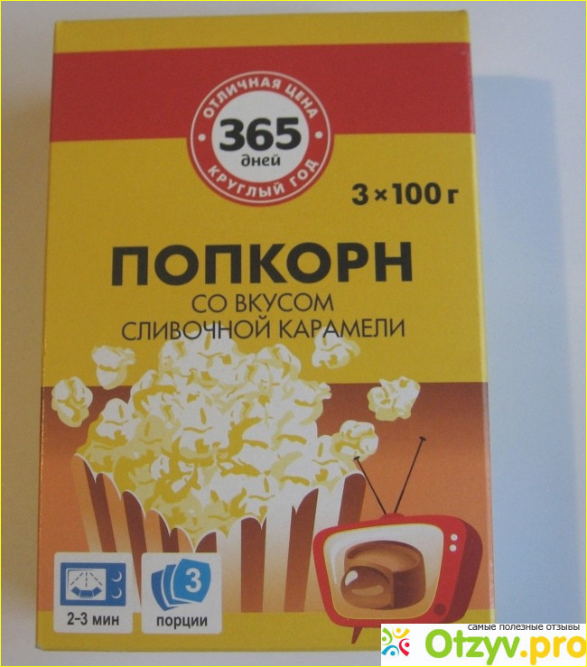 Позже увидела, что продается такой попкорн не только в таких маленьких пачечках, но и в больших упаковках, которых хватает на долго. При желании такой попкорн можно сделать дома и пойти с ним в кино, очень экономно получается, если учитывать огромные цены на попкорн в кинотеатрах. Всем советую попробовать такой недорогой попкорн торговой марки "365 дней".