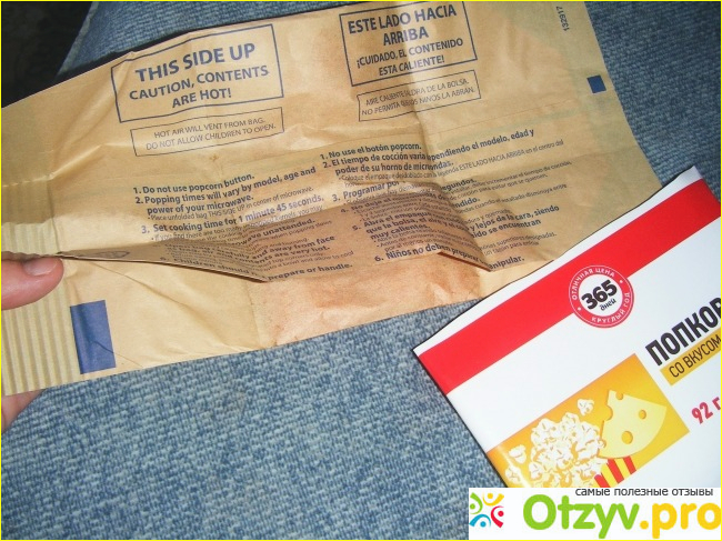 Раньше я покупала попкорн и готовила его в закрытой стеклянной тарелке для микроволновки, в этот раз такой тарелки у меня не было, и я обрадовалась, когда оказалось что попкорн 365 дней находится в упаковки бумажной, которую просто необходимо положить в микроволновую печь и просто следить пока щелканье не прекратится, пока все зернышки не приготовятся.