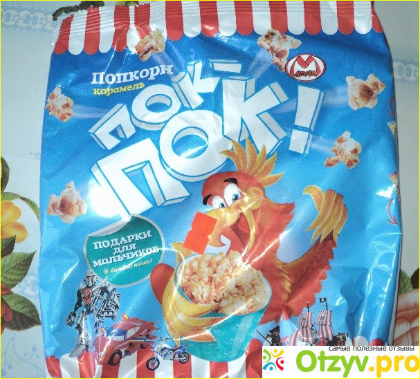 Яркая упаковка на прилавке магазина всегда бросается в глаза. Почему же еще мы выбрали этот продукт? Во-первых, попкорн такой намного дешевле, чем в кинотеатрах, детских парках и прочих местах скопления людей. Во-вторых, он уже готовый. В-третьих, привлекла внимание надпись на упаковке – Подарки для мальчиков в каждой пачке (это в синих пачках, в розовых надпись – подарок для девочек в каждой пачке). Что ж , взяли на пробу. Попкорн нам понравился, не сильно, конечно, сладкий, но вкусный. Чувствуется карамельный привкус.