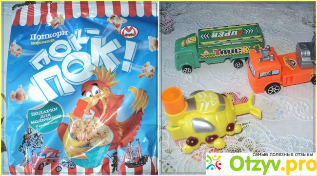 При вскрытии упаковки внутри мы обнаружили прозрачный пакетик с игрушкой - довольно таки внушительных разсмеров машинка. Ребенок был доволен. Вот так выглядит упаковка попкорна от Матяш «Пок-пок! » со вкусом сладкой карамели (для мальчиков) и наши сюрпризы из нескольких пачек.