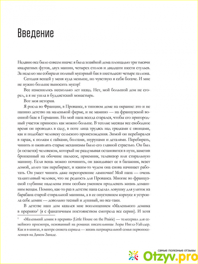 Мне очень понравилось, что автор легко и непринужденно рассказывает о том, как она пришла к мыслям о том, что все идет не совсем так как ей хотелось бы. Не смотря на то, что у нее было все, хороший муж, отличные дети, огромный дом, идеальный газон и регулярные покупки всего в достатке, она поняла, что драгоценные часы жизни тратятся не лучшим образом. Осмотрев свое жилище она заметила тысячи предметов которые стали просто хламом, их никто не помнил и не использовал.