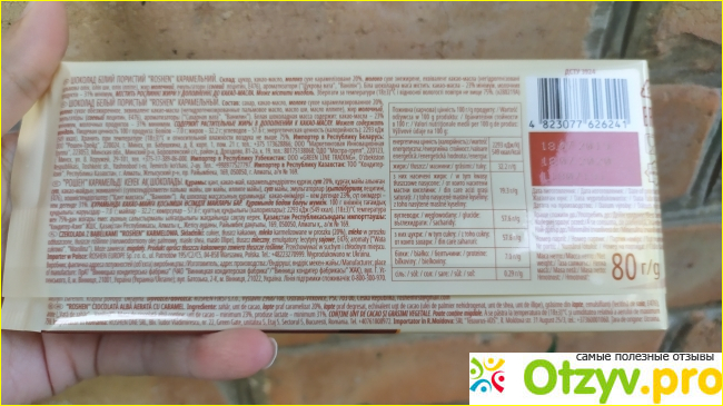 Шоколад нежно карамельного цвета, немного темнее чем просто белый шоколад. Плитка разделена на кубики.