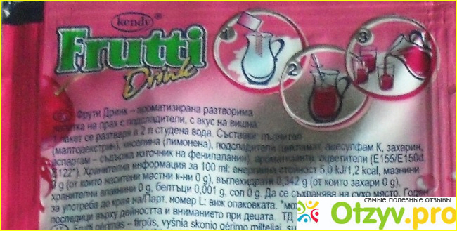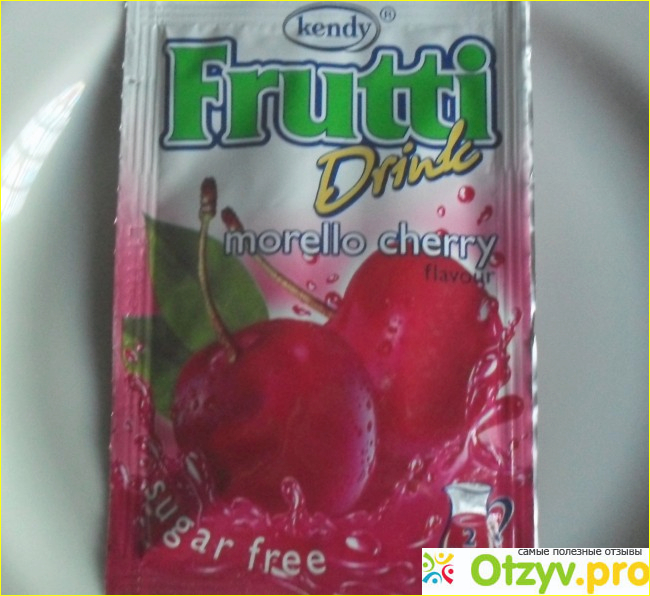 Эти пакетики привлекли мое внимание тем, что на них указано "Без сахара". Судя по рисункам становится понятно, что содержимое нужно растворить в 2-х литрах воды и получится напиток со вкусом в данном случае вишни .