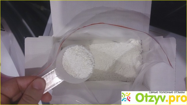 Внутри коробки удобный пакет с застежкой-молнией, а также в комплекте с порошком идет мерная ложечка.
