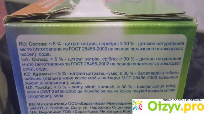 В состав порошка входят только натуральные компоненты - детское мыло, сода, цитрат натрия и серебро. Мыло натуральное, изготовлено по ГОСТу, оно эффективно отстирывает различные загрязнения. Сода в составе усиливает действие других компонентов. Ионы серебра обладают дезинфицирующими свойствами, удаляя бактерии. О мягкости воды и защите от накипи вашей стиральной машины позаботится цитрат натрия. Состав просто идеален!
