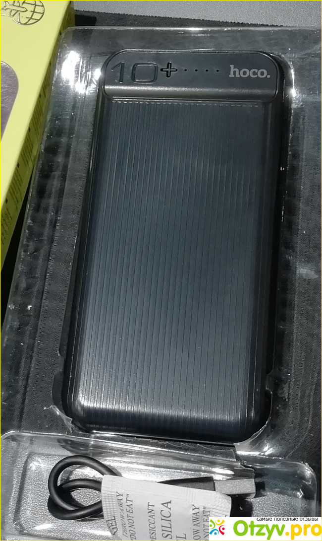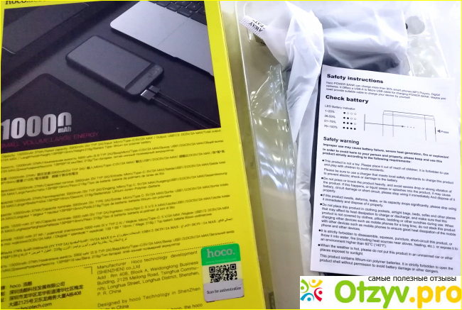 В комплекте универсальной аккумуляторной батареей НОСО J52 идет 1 короткий кабель ЮСБ-микроЮСБ и небольшая инструкция на английском. В отзывах на портативный аккумулятор Hoco многие жалуются на качество заводского провода USB - micro USB, и действительно, через него заряд не очень хорошо: медленно. Поэтому, если столкнетесь с чем, что повер банк долго заряжает ваш телефон, часы, планшет или любое другое устройство - попробуйте через другой кабель.