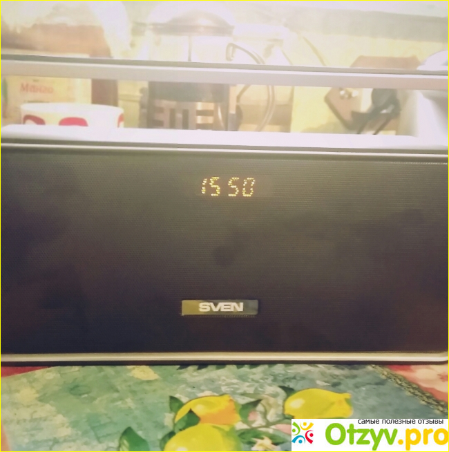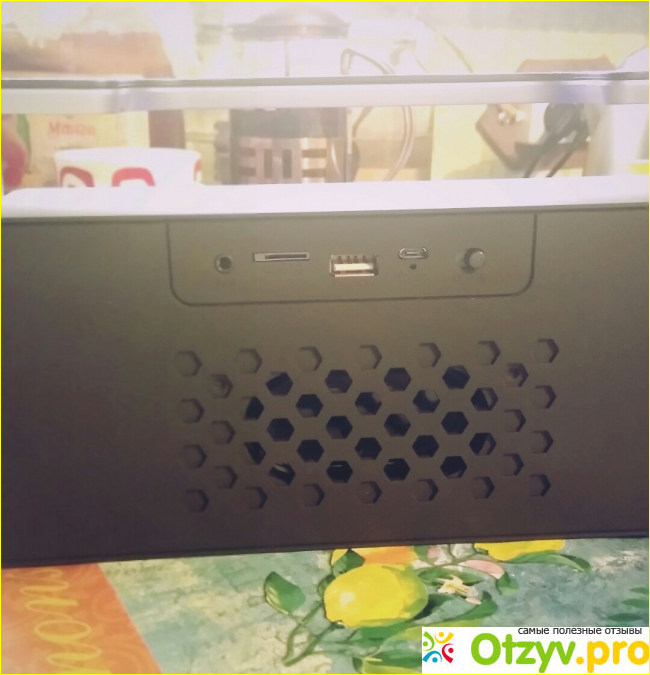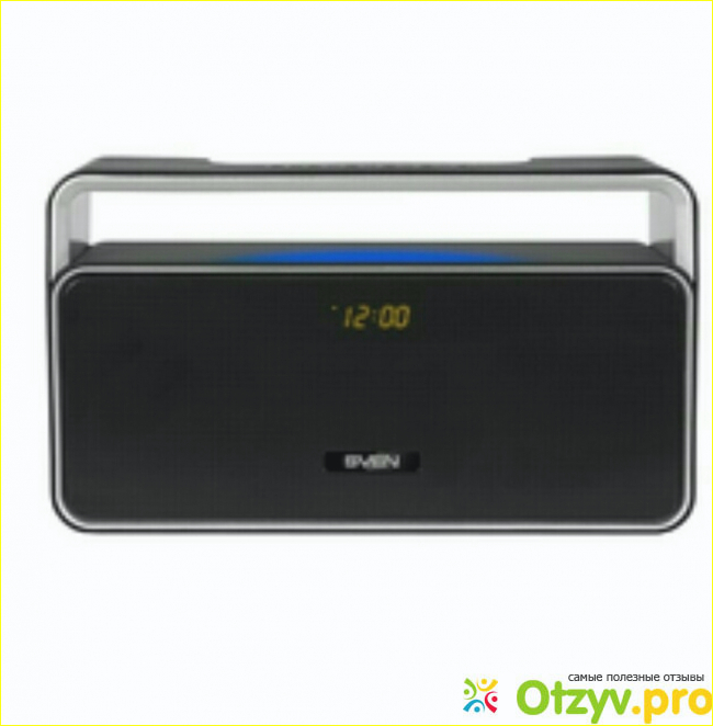 С разъёмами полный порядок, на все вкусы. Имеется полноценный USB вход под флешку, micro USB для зарядки, разъём под SD карту и отверстие под Audio Jack для подключения смартфона через шнур, который прилагается в комплекте. Для зарядки есть шнур micro usb-usb, но к сожалению без самого зарядника, в принципе подойдёт любой от какого-нибудь смартфона или сотового телефона. Имеется функция часов и будильника, спереди за решёткой спрятался незаметный дисплей. Правда настраивать часы и будильник большое мучение, я так и не смогла разобраться, иструкция маленькая и тупая, из неё ничего не понять. Быстро плюнула на затею с часами, так как они мне и будильник не нужны. Радио ловит и без включеного шнура, только мощные станции, приём станций нечувствительный. С флешки играет хорошо, жалко только, что папки не видит, карту памяти не вставляла, без надобности. По Bluetooth со смартфоном соединился моментально, качество приёма до 7 метров устойчивое, дальше как придётся.