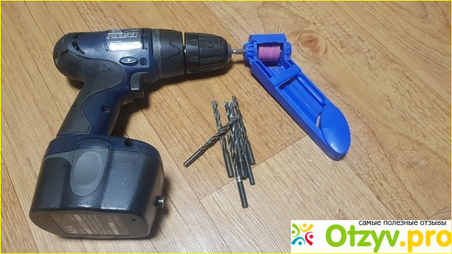 Принцип работы и конструкция достаточно просты. Точильный круг с шестигранным наконечником ставится в патрон дрели или шуруповёрта, а в другой стороны на валу держится пластиковый податчик свёрл. На нём 3 бороздки, предназначенные для одного из диаметров. Общий разброс размеров от 2 до 12,5 миллиметров. В принципе самые используемые размеры.