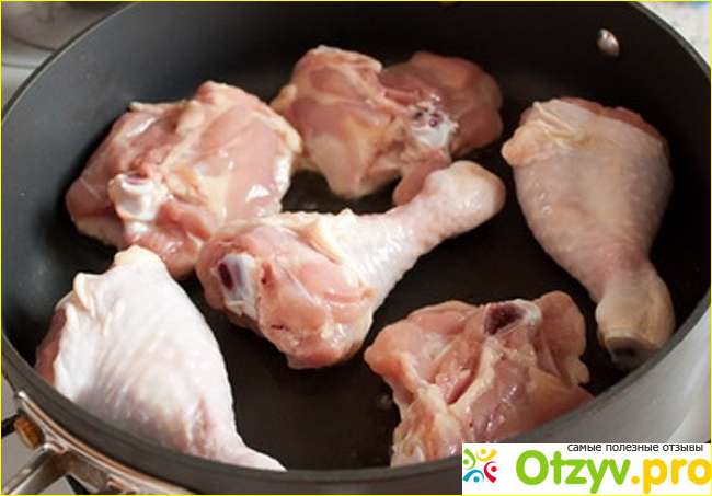 Далее приступаем к обжарке мяса. Для этого кладем куски курицы на сковороду, предварительно сильно разогретую. Масло или жир не добавляем. Куски курицы хорошо обжариваем с обеих сторон до румяной корочки. Сковороду не накрывать.