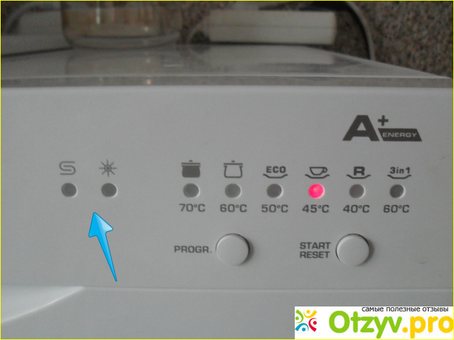 Синей стрелкой я показала индикаторные лампочки отсутствия соли и ополаскивателя. Когда их нужно добавлять, машина подскажет, лампочки загорятся.