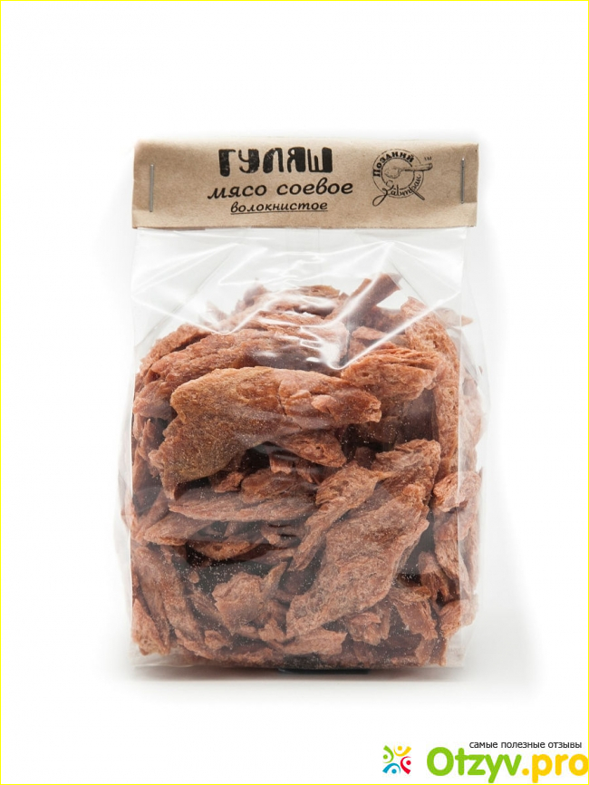 За 150 гр я заплатила 280 рублей. Это не тепичное соевое мясо в виде простейшего текстурата. Здесь более сложный состав из глютена, соевого изолята, сои, соды, соли. Кусочки внешне выглядят более темными, красноватыми, крупные, как раз подходящие под гуляш. Приготовление требует стандратной подготовки с замачиванием сухих кусочков в воде. После чего нужно придать им желаемый вкус используя дополнительные игредиенты в виде соевого соуса, чеснока, специй, томатной пасты. Я попробовала приготовить несколько блюд и осталась вполне довольной своей покупкой.