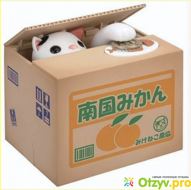И еще мы как-то заказывали такую интересную копилку - кот воришка. Детям тоже очень понравилась. Внешний вид у нее, как обычная почтовая коробка и на ней рыбка. На эту рыбку нужно класть монетку, а потом из коробки высовывается лапка котика и он ее забирает. Таким образом копилочка у нас заполнилась очень быстро.