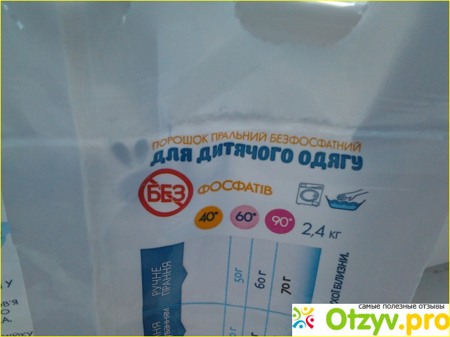 Как видно на фото - данный порошок не содержит фосфаты, это несомненный плюс! Стирает он и при 40, и при 60, и при 90 градусах воды, единственное, нужно учитывать количество порошка для ручной, машинной стирки, так как оно конечно разнится.