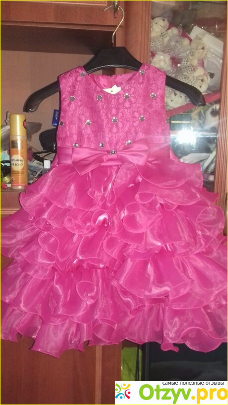Платье без рукавов, кое-где торчат нитки, но это не критично. Цвет яркий, воланы на юбке крупные, все камешки на месте. Сзади на талии платье завязывается атласной лентой на бант.