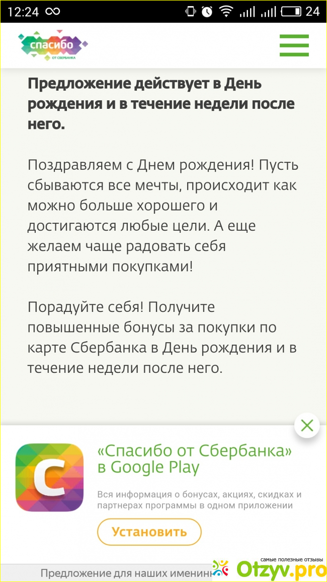 А настоящий сервис Сбербанк Спасибо в день рождения предлагает только повышенные бонусы.