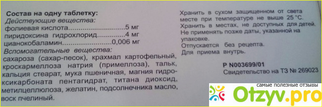 В составе витамины группы В (фолиевая кислота, пиридоксин, цианокобаламин). О пользе фолиевой кислоты полезно писать не буду, но это один из важных витаминов как для женщины, так и для плода. Все эти витамины нужны для развития плода. К слову содержание фолиевой кислоты здесь целых 5 мг.