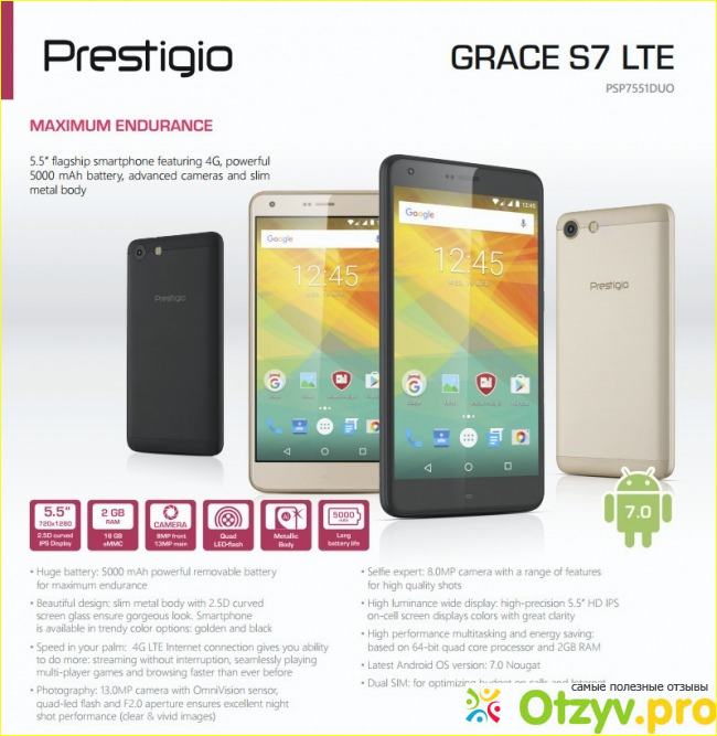 Вот уже как три месяца она им пользуется, пока никаких проблем с работоспособностью она не испытывала, единственное, на что она жалуется, так это на качество звука. А теперь давайте более детально рассмотрим все основные преимущества и недостатки смартфона Prestigio Grace S7 LTE. Кстати телефоны вышли на продажу именно в этом году.