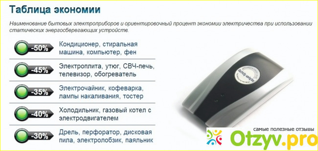 С помощью данного прибора можно сэкономить от 15 до 40 процентов потребляемой энергии. Но также, стоит обратить свое внимание на то, что экономия будет завесить от количества и вида приборов. К примеру, если есть желание сделать ремонт, то использование таких электрических приборов как, к примеру, перфоратор, дисковая плита, дрель или электролобзик - просто неизбежно. Их результат можно снизить на 30%. Кофеварки, тостеры, электрочайники или лампы накаливания экономится до 35-45 процентов. За использование компьютера, стиральной машины и кондиционера придется заплатить на половину меньше чем обычно.