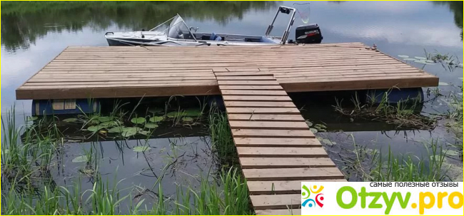 Настил сделали из доски пяти десятки. Все пиломатериалы обработали антисептиком. Сам настил построгали электрическим рубанком с одной стороны. Против заноз. Покрасили для надежности краской. Сооружение к берегу прикрепили двумя укосинами из металлического троса. Концы троса на пирсе сделали подвижными. Для этого металлический штырь с петлей воткнули в обрезок трубы. Ну и наконец, небольшой мостик. Все сделали вшестером за один погожий субботний день.
