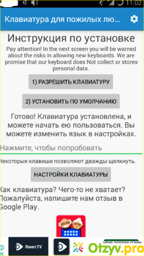 Чтобы начать пользоваться клавиатурой, нужно зайти в приложение и нажать на экране "Разрешить клавиатуру" затем выбрать пункт меню "Клавиатура для пожилых людей" и поставить галочку в квадратике возле нее.