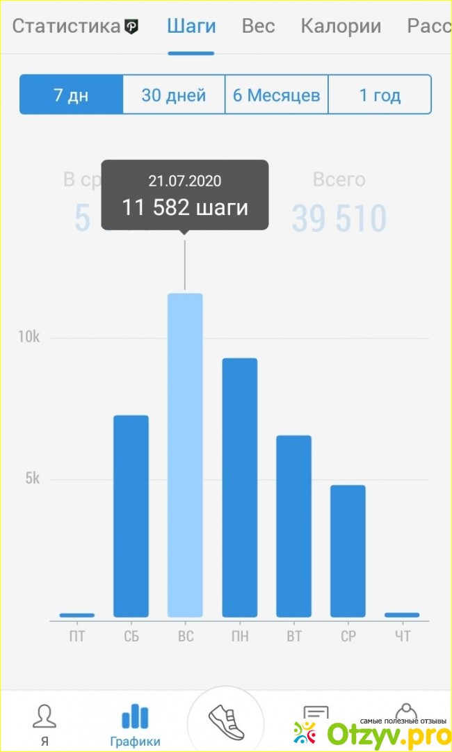 Вот график за последнюю неделю – очень неровная "пила". Однако по факту я примерно одинаково хожу. Просто картинка отражает неправильные подсчеты этого приложения.