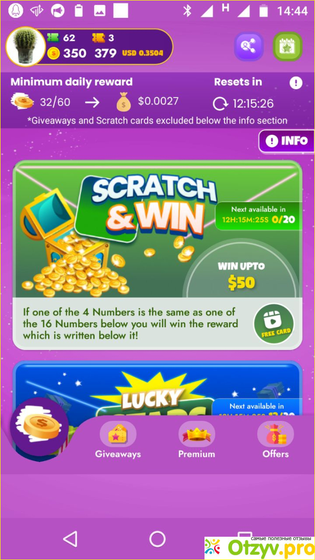 Игра выводит также на paypal, coinbase, advcash, perfect money и другие системы. Есть реферальная программа. Если стереть в сутки 60 скретч карт, посмотрев при этом 60 реклам, можно получить 0.06 цента в день. Но карты не всегда есть, за этим нужно следить.