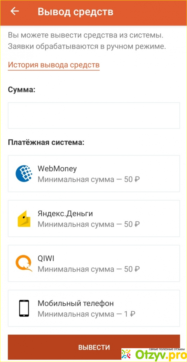 Заработанные деньги можно выводить на мобильный телефон, ВебМани, Яндекс Деньги, а также на Киви. В то время, когда я установил приложение, на электронные системы был вывод от 50 рублей, а на мобильный телефон от одного рубля. Сейчас же стал вывод на все 50 рублей. И мою заявку, где было около двух рублей система отклонила. Также невозможно поменять систему вывода, то есть, если вы при регистрации указали вывод на мобильный телефон, то и будете все время туда выводить свои заработанные деньги.