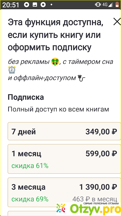 Слушать книги без рекламы очень удобно. Я не заметила, как пролетела пробная бесплатная неделя подписки. Дальше нужно было за подписку платить. 349 рублей стоит подписка на неделю, 599 рублей на месяц, 1390 рублей за три месяца. И можно даже оформить подписку на год. Я пока не готова оформлять платную подписку, тем более, что это стоит не так уж дешево.