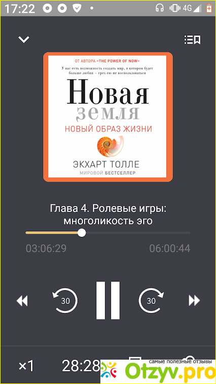 В приложении есть несколько интересных функций: можно увеличить, можно уменьшить скорость прослушивания, можно выставить таймер и чтение книги выключится само через 20, 30 минут или позже, можно добавить понравившуюся книгу в закладки.