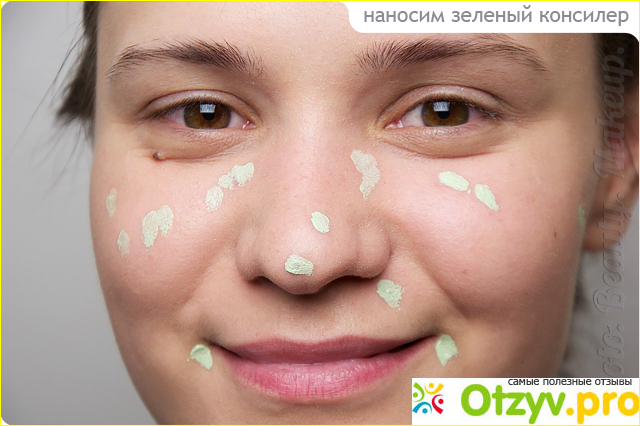Не нужно наносить зеленый консилер как тональное средство. Это очень пигментированный продукт, поэтому наносим точечно, пальцем или маленькой кистью на проблемные зоны (точечно на каждое покраснение), ни в коем случае не размазываем, а вбиваем пальчиками, чтобы перекрыть зеленым цветом всю красноту. Если одного слоя недостаточно - ждём 3-5 минут и повторяем процедуру. После нанесения зеленого консилера также ждем 3-5 минут до его высыхания и только потом сверху наносим тональную основу, делаем контуринг, если это нужно. В конце обязательно закрепляем макияж пудрой.