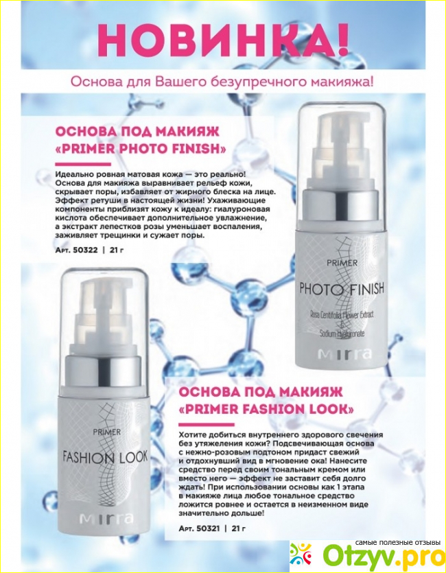 Праймер не дает коже сохнуть, проводит все полезное от крема, но не дает впитываться тональному и пудре, защищает от ультрафиолета, мороза, жары, солнечного света. Базы нужно всего лишь каплю, чтобы покрыть все лицо, экономно расходуется, запаха не заметили. Приятно матирует и создает базовый тон, кожа уже не тусклая с ним, а более живая и упругая. Пробовала немного на ресницы при помощи кисточки. Тушь на базе не склеивает ресницы, они получаются объемнее, есть удлинение, пушистость и точное разделение, предохраняет ресницы. Блеска на лице нет, не отпечатывается. На столько невесомая, что ее не чувствуешь на лице. Аллергической реакции не вызвала, привыкания тоже, буду еще заказывать.