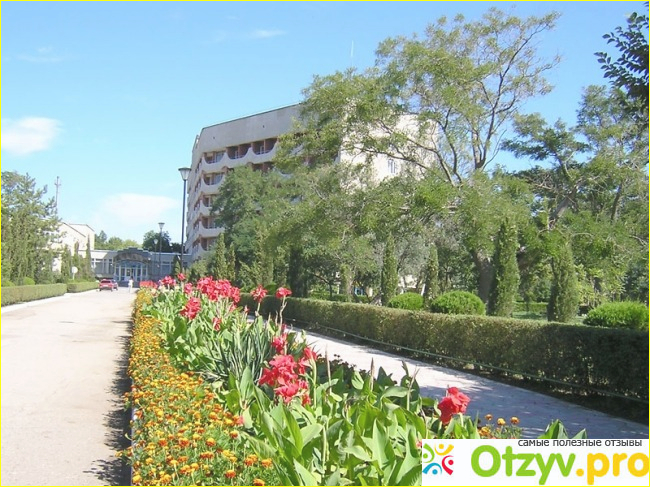 Корпуса санатория расположены на собственной территории, утопающей в зелени. На зеленых лужайках оборудованы детские площадки, так что маленьким гостям тут скучать не придется. Около главного корпуса расположены два открытых бассейна, а клумбы украшают красивые цветы. На всей территории царит идеальная чистота. Пляж собственный, песчаный, заход в море постепенный. На пляже могут находиться только гости санатория, поэтому здесь нет ни торговцев шашлыками, ни фотографов, ни кого другого. Пляж оборудован лежаками и навесами от солнца, так же здесь работает весь купальный сезон медпункт. Номера есть как класса стандарт, так и повышенной комфортности. Не смотря на то, что здание санатория было построено давно, в номерах свежий ремонт, удобная мебель, холодильник, телевизор, кондиционер, санузел с душевой кабинкой или ванной, балкон. И в каждом номере какая - то уютная, домашняя атмосфера. Питание в санатории четырехразовое, по принципу "заказ меню". Готовят разнообразно и очень вкусно.