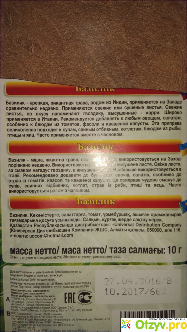 Продается она в сухом виде в пакетике. Я не представляю как я раньше готовила без нее. Сейчас покупаю просто по несколько штук и пересыпаю в удобную баночку которая всегда под рукой и добавляю везде. Я добавляю ее в супы, во вторые блюда, я даже в соус для пиццы ее добавляю. Моя семья в полнейшем восторге. Базилик дает просто невероятный, потрясающий аромат и придает любому блюду неповторимый вкус. Никогда не думала, что всего лишь с помощью одной добавки можно изменить кардинально аромат и даже вкус обычного борща. Конечно в сухом виде ее употреблять нельзя, она даже горькая и совсем не вкусная, но когда ее добавляешь при приготовлении блюда то это просто ах. Без нее уже и привычные блюда кажутся какими то пресными. Добавляю я ее не боясь переборщить. Смело могу добавить и три, четыре столовые ложки на кастрюльку в три литра супа. Кашу маслом не испортишь! Это выражение в данном случае очень подходит. Рекомендую каждой хозяюшке. На моей кухне это номер один.