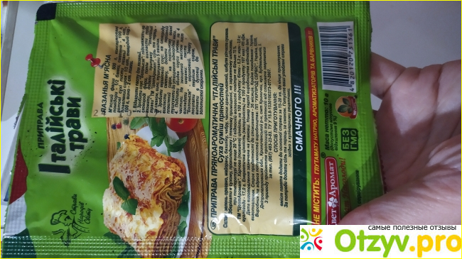 В составе много ароматных и полезных трав, таких как майоран, базилик, орегано и другие. Специи с сушеным луком и чесноком, но аромата чеснока практически не слышно.