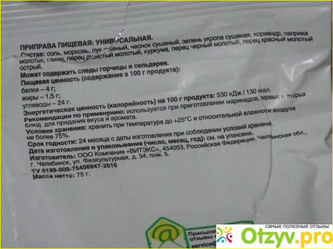 Упаковка как и у всех приправ данного производителя обыкновенная, без всяких рисунков и реклам. Объем данной приправы 75 грамм. Довольно таки большая упаковка и по ооочень выгодной цене. Подобные приправы других знаменитых производителей намного дороже, но эта ничем не хуже их, а может и даже лучше многих.