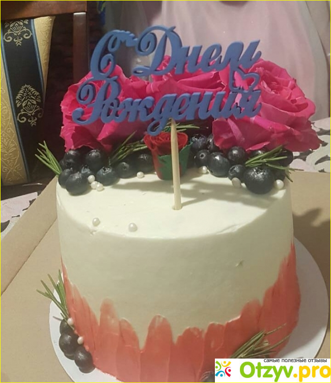 Предварительно, промаслила их кремом, соответственно четыре слоя. Необходимо дать денек, чтобы коржи пропитались кремом. Верхний слой из ягод черной смородины. Затем сложила их друг на друга. Вокруг тоже обмазала кремом с разными цветными пищевыми добавками. Сверху разукрасила живыми цветами и свежими ягодами голубики и ежевики. Весь торт обложила зелеными веточками розмарина. Вот получился небольшой, необыкновенно чудненький, вкусненький и прекраснейший тортик! И еще сверху надпись "С днем рождения". Торт получился на славу!