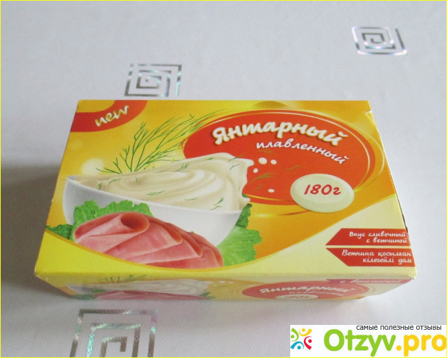 Продукт похож на плавленый сыр. Он желтоватого цвета. Консистенция однородная, если не считать вкраплений ветчины.