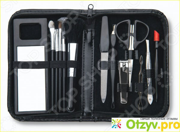 Все детали вмещены в черный чехол, сделанный из натуральной кожи. Он включает в себя 13 отделений для инструментов и удобную застежку. Также в комплект входят: зеркало, 5 кисточек разной формы для макияжа, маникюрные ножницы, пилка, триммер, шабер, книпсер, щипчики и пушер для ухода за кутикулами.