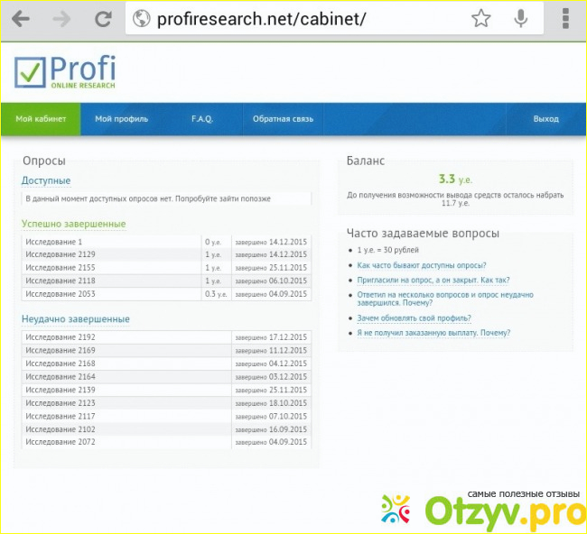 Опросов на сайте много, хотя приглашения на почту приходят редко, стоит следить за ними в личном кабинете. Платят за один опрос по разному, в зависимости от длительности- от 0,1 до 2 условных единиц. В среднем мне удается пройти до конца примерно 40-45% опросов. Минус в том, что опросы оформлены таким образом, что нет шкалы длительности, нельзя ориентироваться, сколько времени займет заполнение. Часто бывают исследования на тему продуктов питания, банков, услуг страхования. В последнее время достаточно часто бывают опросы, которые подразумевают в последствии сеанс связи по скайпу, когда будут задавать дополнительные вопросы, это дополнительно оплачивается.